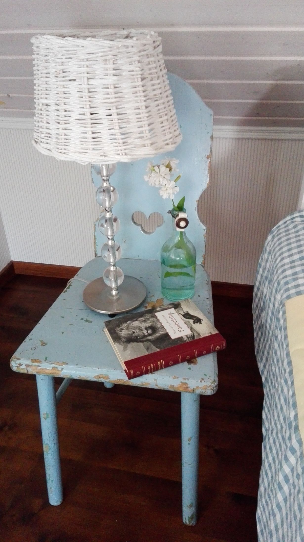 Parisänkymme yöpöydät löytyivät erään omakotitalon omistajan muuttokirpputorilta Jyväskylän Älylästä. Väri on alkuperäinen ja se sointuu hyvin sängynpeittomme sävyihin. Mieheni on halunnut maalata ne monta kertaa, koska maali irtoilee jo, mutta toistaiseksi niille ei ole saanut tehdä mitään Lukulamput on koottu Pentikin lampunjaloista ja marketista ostetuista rottinkista varjostimista. Yöpöydälläni on aina kirjoja ja näin kesäisin omasta puutarhasta poimittu kukka vanhassa juomapullossa.
