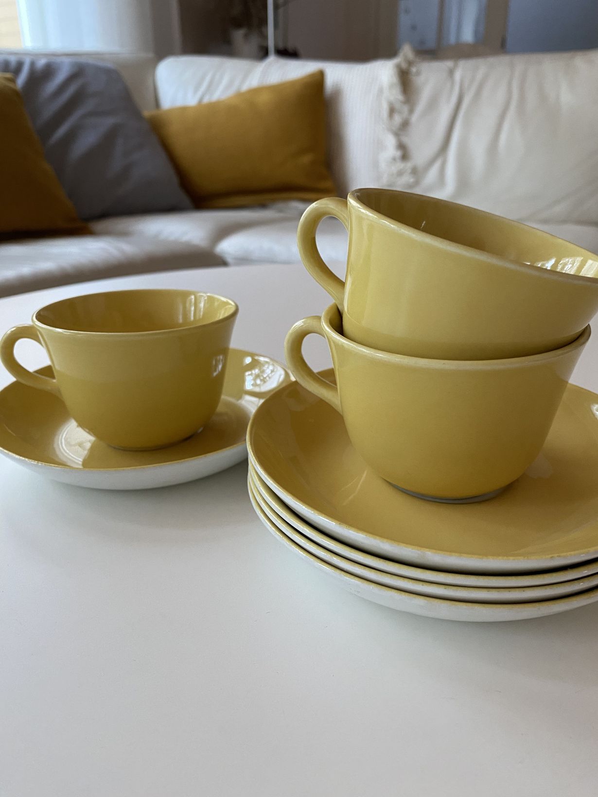 Nämä kupit pääsivät meille ystäväni siivottua heidän mökkiään - ja ihanat aarteethan nämä ovat! Näistä on syöty jälkiruokaa ja viimeksi kasvatin väri-iloksi ja syötäväksi näissä yrttejä. Kaapissakin nämä tuottavat väri-iloa läpi vuoden💛