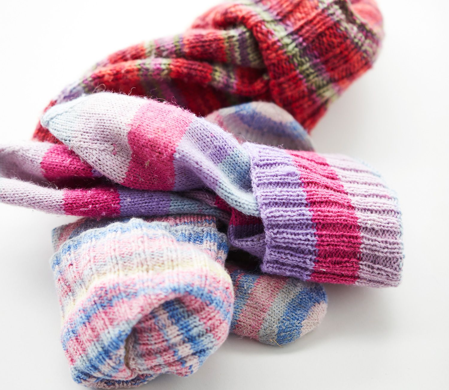 Kun villasukan kanta ja varpaat ovat kerta kaikkiaan kaputt, leikkaa jalkaterä pois ja ompele varsista säärystimet tai rannekkeet.