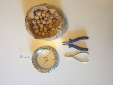 Leikkaa jämäkästä, 2 millin paksuisesta rautalangasta seitsemän 36,5 senttimetrin pituista pätkää, joihin mahtuu tarkasti 18 puuhelmeä kuhunkin.