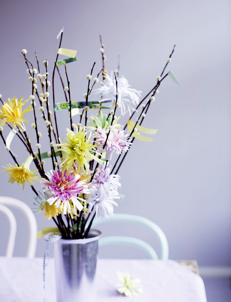 Tarvikkeet: Valkoista kopiopaperia, ohuita väri- ja kuviopapereita. Teippiä, metallilankaa, liimaa. Pajunoksia.
