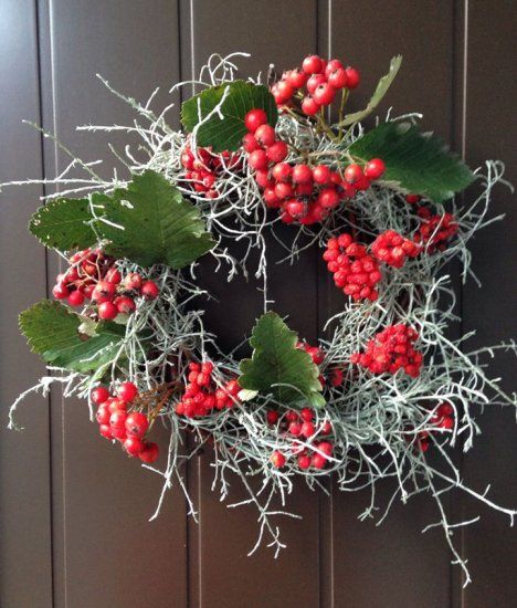 Ninan nopea kranssi syntyi, kun hän kiinnitti rautalangalla valmiin pajukranssin päälle oksia hopealanka-pensaasta. lehtiä ja pihlajanmarjaterttuja.