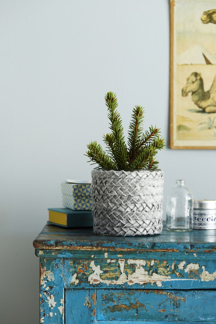 Harmaa huopa on yhtä aikaa trendikäs ja perinteinen. Tee huopakuusista vaikka kokonainen metsä tai kaunista pöytäkuusen ruukku harmaalla huopaletillä.