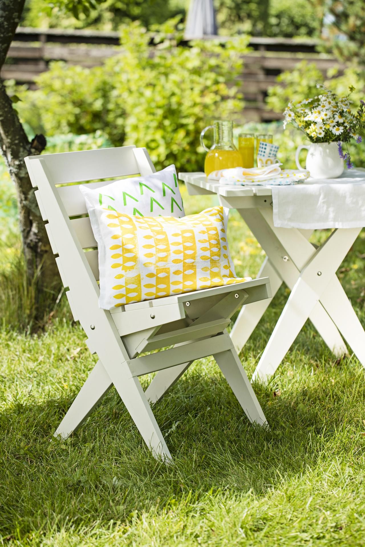 Vihreät kolmiot painettiin valmiiseen tyynynpäälliseen itse tehdyllä sabluunalla, jonka kuvan näet alla. Keltainen lehtikuvio painettiin Softis-levystä tehdyllä sabluunalla pellavapyyhkeeseen, joka ommeltiin tyynyksi. Puutarhatuoli ja -pöytä Westanqvarn, pellavapyyhe Stockmann, astiat Astialiisa.