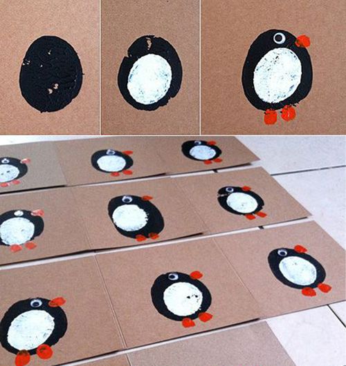 Ennenkuin käytät kaikki perunat laatikon tekoon, valikoi pari korttien painamista varten. Somat pingviinikortit tulevat kuin liukuhihnalta perunaa apuna käyttäen. Töpötä vanupuikolla nokka ja jalat, ja liimaa irtosilmät tipuselle. Lähde