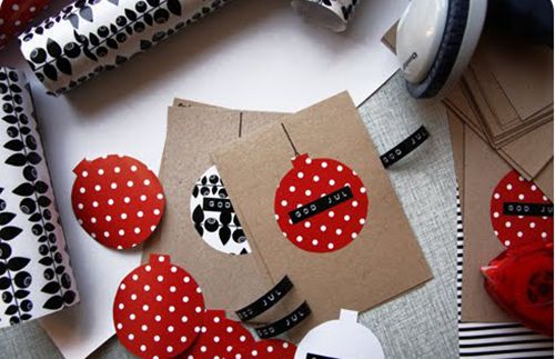 Yksinkertainen idea on leikata lahjapaperista joulupallonmuotoisia siluhuetteja ja lisätä päälle dymo-koneella tehty toivoitusteksti. Lähde