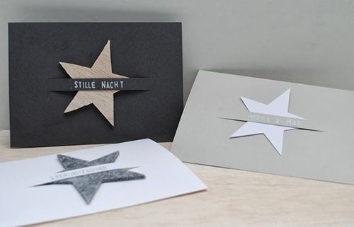 Tyylikästä ja selkeää. Leikkaa huovasta, kartongista tai ohuesta vanerista tähtiä tai sydämiä ja pujota ne korttipohjaan mattoveitsellä tehtyihin viiltoihin. Lähde