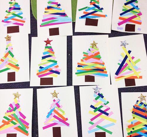 Iloisen värikkäitä kuusikortteja varten tarvitset läjän kirkkaanvärisiä papereita, liimapuikon ja sakset. Suikaloi paperit ohuiksi nauhoiksi ja asettele sekaisin kuusen muotoon. Lähde