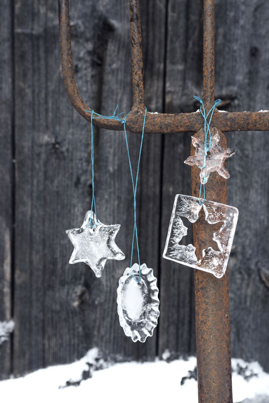 - Isompi tähtikoriste tehdään kahden piparimuotin avulla. Laita neliönmuotoinen muotti lautaselle ja aseta sen sisälle pienempi tähtimuotti. Kaada vettä tähtimuotin ja neliömuotin väliselle alueelle ja anna jäätyä. Kun vesi on jäätynyt täysin, irrota muotit varovasti.