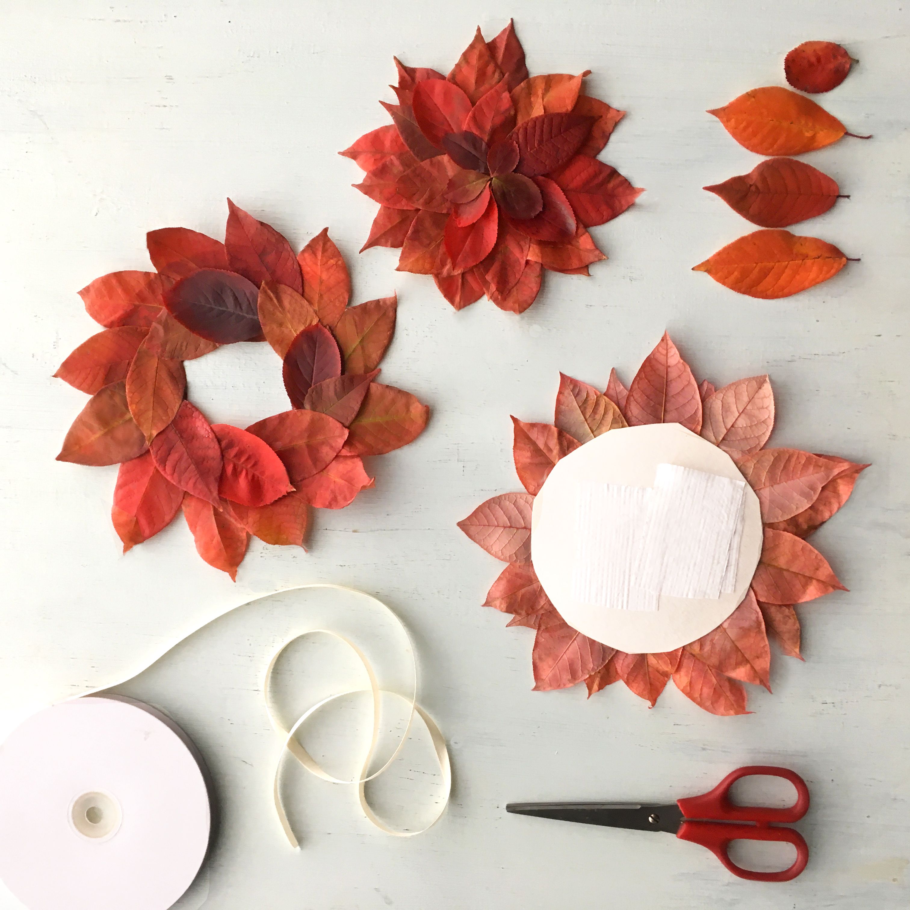 Lehtiruusukkeet ja kranssi on tehty tuoreista lehdistä. Kuivuessaan ne jäävät kauniisti koholle.