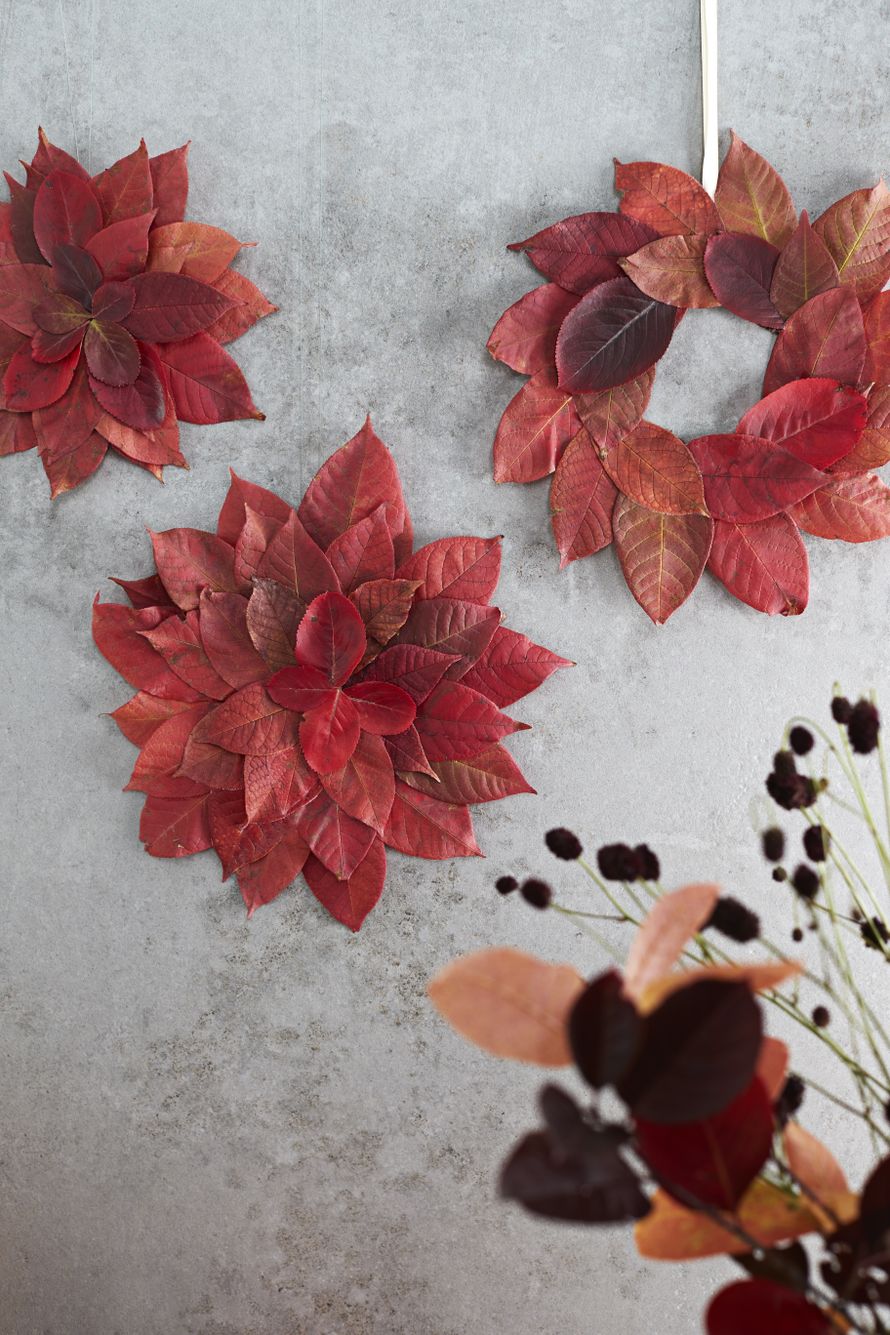 Kerää ruskaretkeltä ainekset somiin seinäkoristeisiin. Näihin koristeisiin käytettiin marja-aronian lehtiä. Ne hehkuvat upean punaisina kuivattuinakin ja ovat sopivan tanakoita askarteluun.
