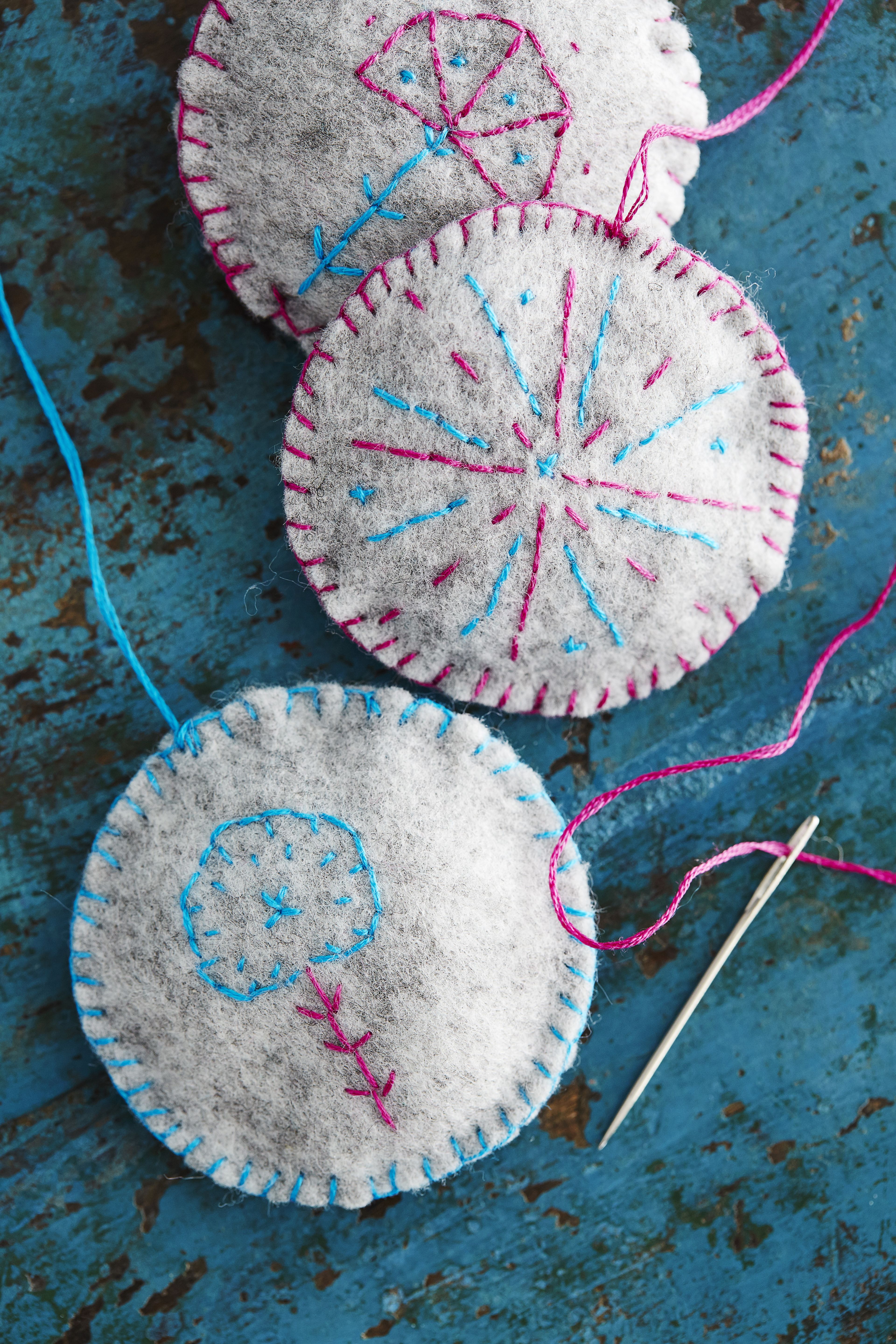 Leikkaa huovasta kaksi kuusta tai palloa. Kirjo niihin halutessasi kuvioita yksinkertaisin suorin pistoin kirjontalangalla. Aseta kappaleet päällekkäin nurjat puolet vastakkain ja ompele ne yhteen pykäpistoin. Jätä lopussa pieni aukko täyttämistä varten. Laita sisään hieman täytevanua. Ompele aukko kiinni ja kiinnitä ripustuslenkki.