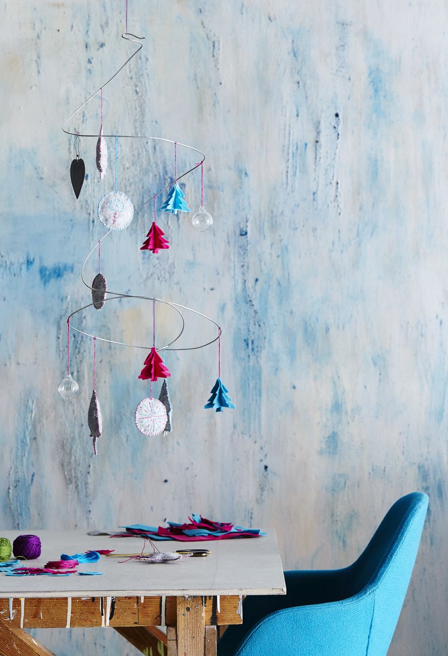 Mobilen kehikko on paksua rautalankaa, joka kestää keveiden huopakoristeiden painon. Pyöräytä rautalanka isoksi kiekuraksi ja kiepauta yläpäähän ripustuslenkki. Ripusta mobile langasta kattoon ja somista se huopakoristein.
