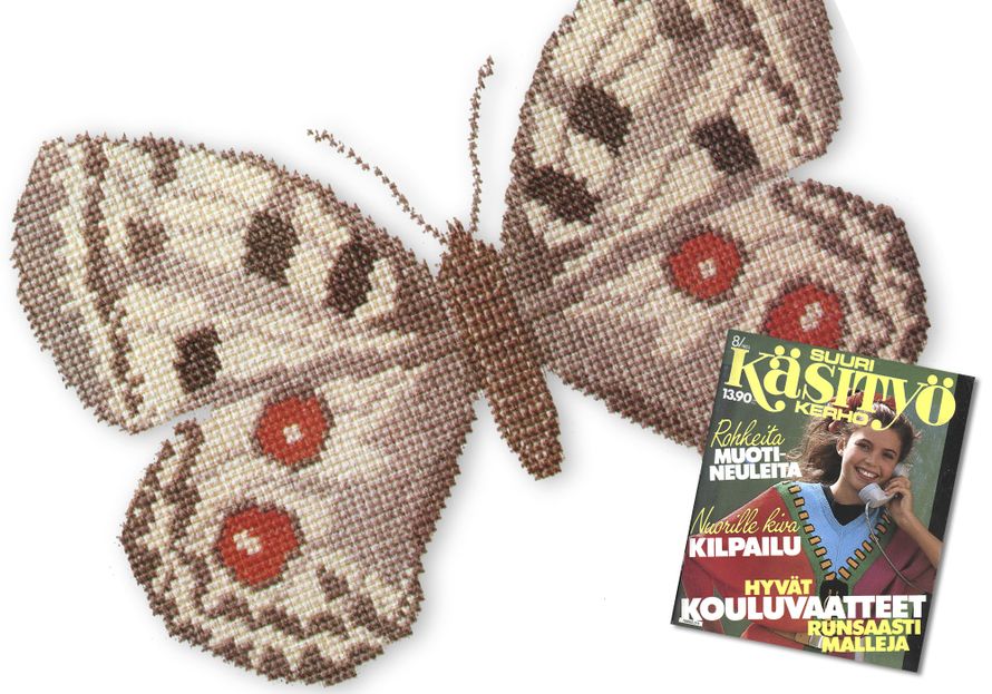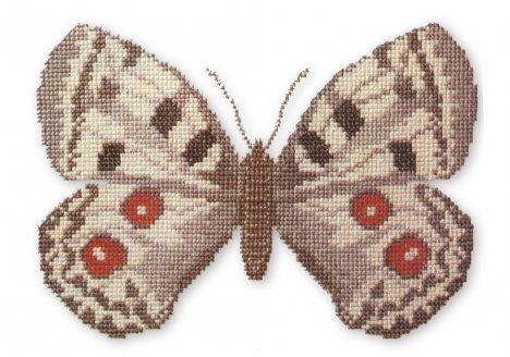 Tunnistatko lajin? Ristipistele apolloperhonen tauluksi. Voit laajentaa perhoskokoelmaasi muita lajeja tutkimalla, siirtämällä väritykset ruutupaperille ja kirjomalla kankaalle.