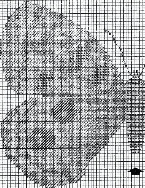 Pistot: Kirjo muliinilangan 2 säikeellä ristipistoja tai piirustuksen mukaan tikki- ja puolipistoja (= ristipistosta vain alapisto). Kirjo pistot pohjakankaan 2 langan yli.