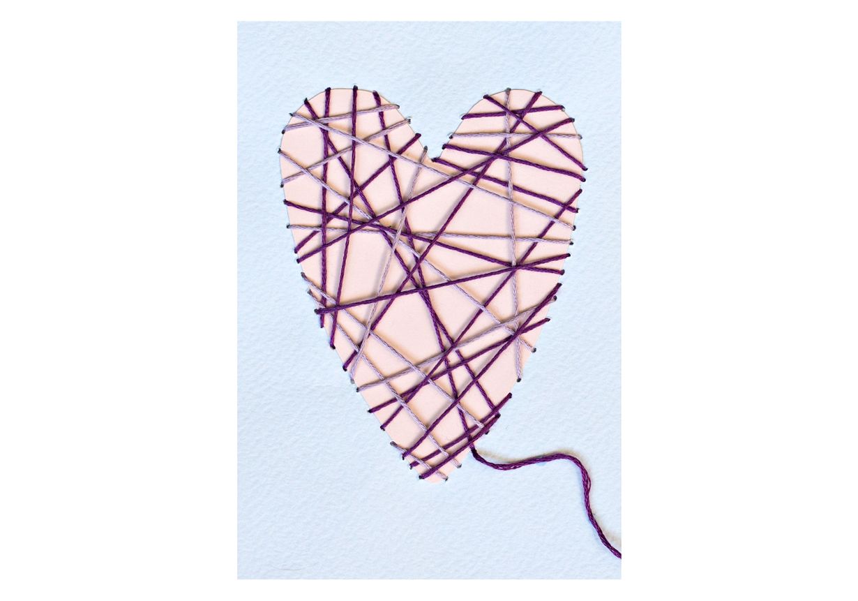 Tulosta korttipohja tästä tai sivun alareunassa olevasta linkistä. Jäljennä sydämen kaava ja leikkaa kaavan avulla sydän vaaleanpunaisesta kartongista. Liimaa sydän harmaalle kartongille ja leikkaa siitä haluamasi kokoinen kortti. Ompele sydämen yli pitkiä pistoja violetilla ja kanervanvärisellä 6-säikeisellä muliinilangalla. Liimaa kortin taakse tukevaa paperia, jolloin nurja puoli jää piiloon.