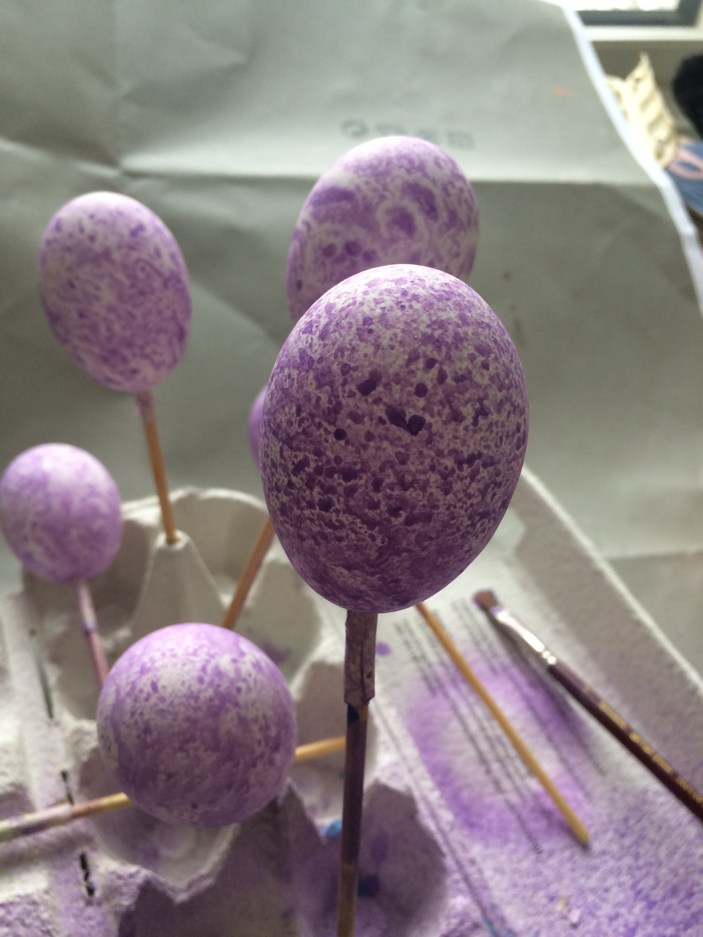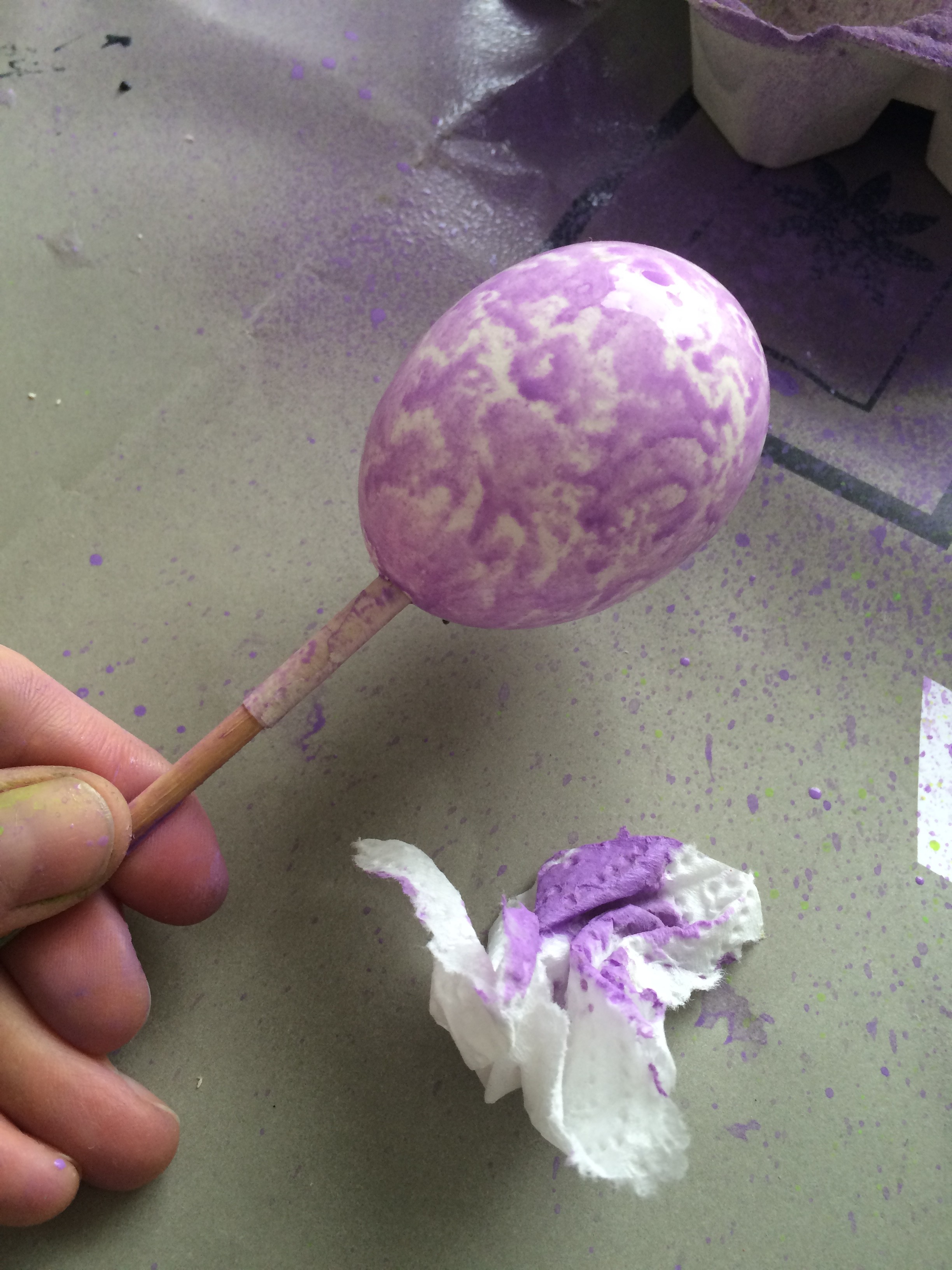 Laimennetulla askartelumaalilla syntyy melko haaleita kuvioita, mutta kauneimman tuloksen saa lisäämällä roiskeita kerroksittain. Anna edellisen kerroksen kuivua välissä. Tikussaan muna on helppo asettaa maalauksen ja kuivumisen ajaksi pystyyn pahviseen munakennoon.