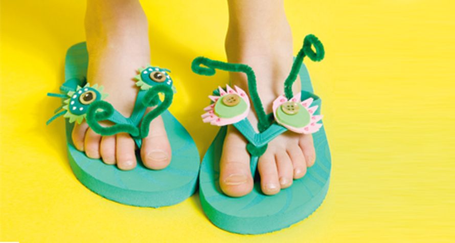 Mikäs sieltä varpaiden välistä kurkistaa? Varvastossut saavat uutta ilmettä, kun liimaat niihin silmät ja tuntosarvet.