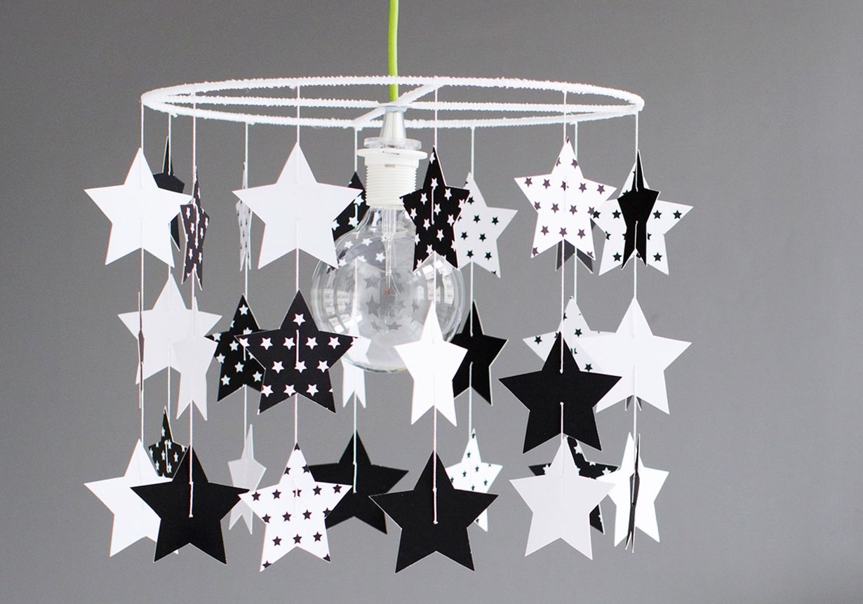 Tulosta musta- ja valkopohjaiset kuviopaperit ja liimaa ne kartongille. Leikkaa kartongista tähtiä ja ripusta ne nauhoina metallikehikkoon. Kiinnitä lampun johto kehikkoon.