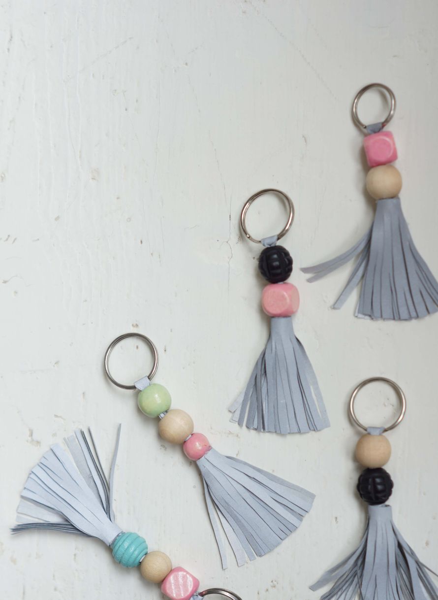 - Sujauta nauha avainrenkaan läpi ja pujota sen molemmat päät kahden puuhelmen läpi.
