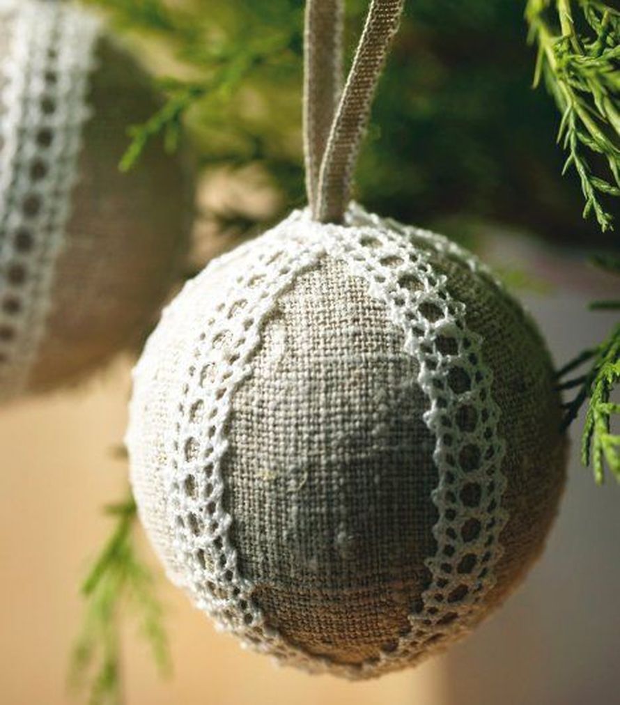 Pellavasta ja pitsistä tehdyt koristepallot sopivat vaikka pieniksi joululahjoiksi ystävälle.