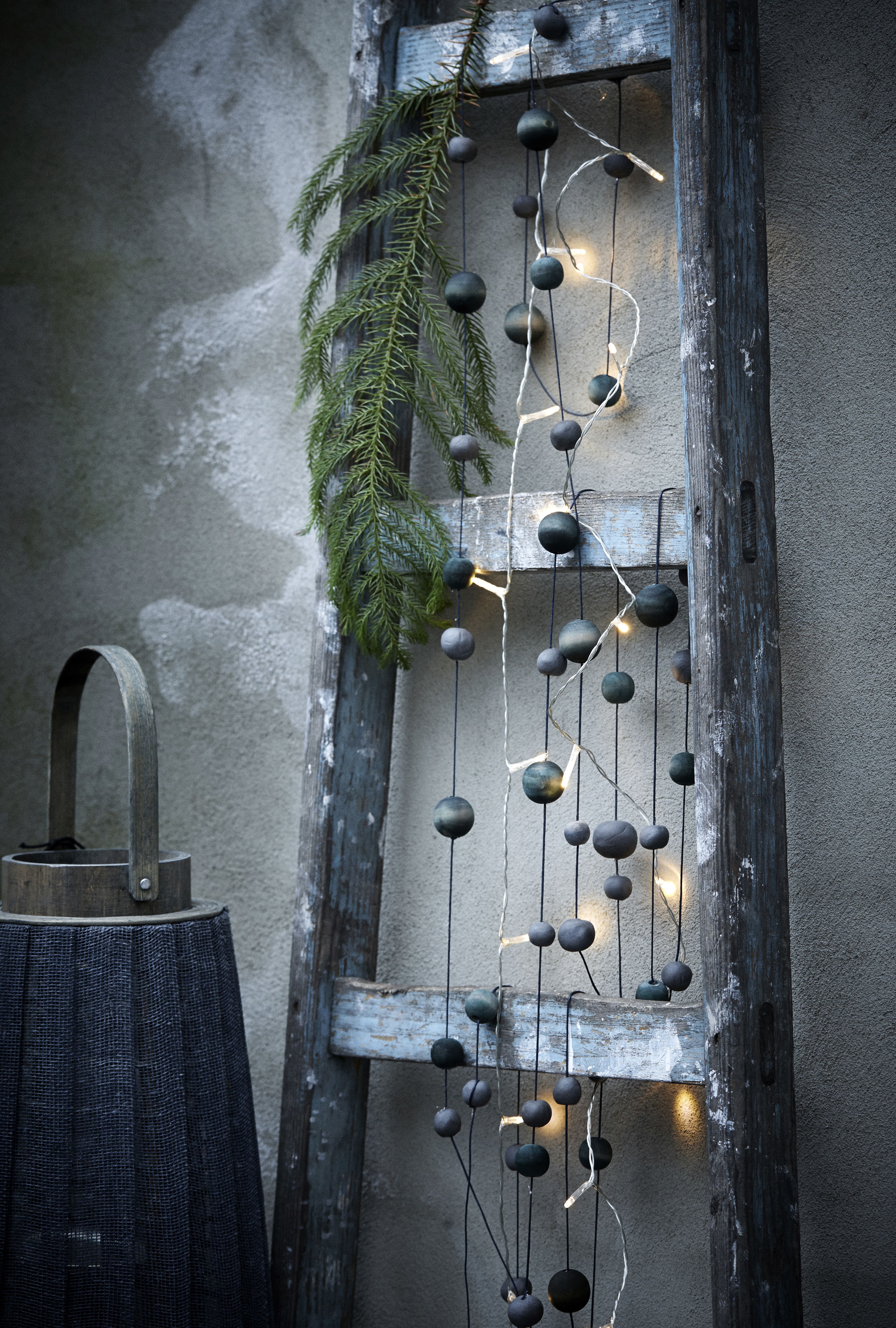 Valmis helminauha koristaa kauniisti vanhoja tikkaita valonauhan lomassa. Valonauha, Ikea.