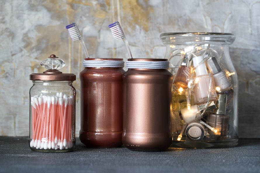 Koristelluista lasipurkeista saa kauniita kodin sisustusratkaisuja. Näillä kolmella ohjeella kylppärin kynsilakat, hammasharjat ja vanupuikot säilyvät kauniisti.