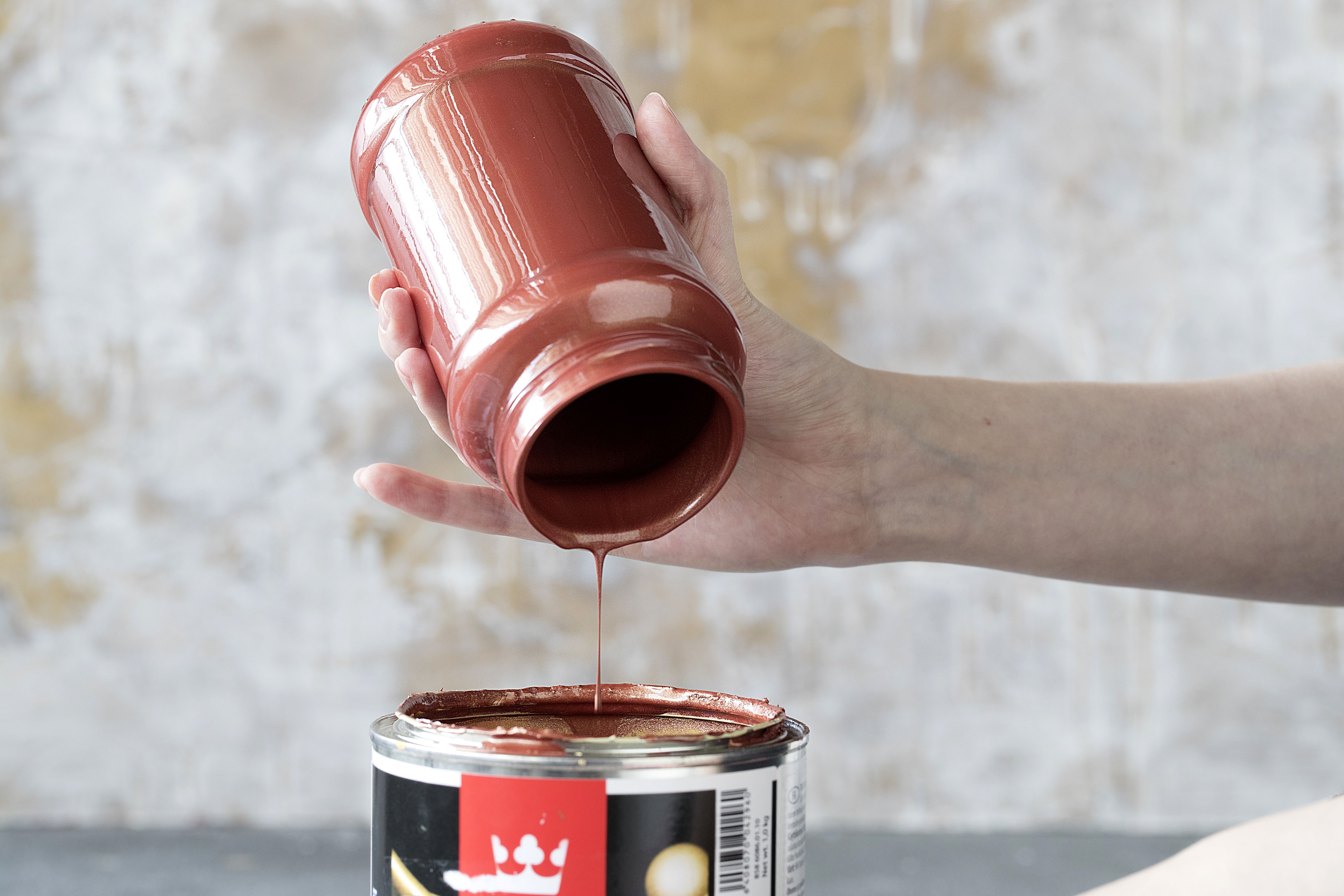 Tyylikkäästä kuparimaalista ja lasipurkista syntyy hammasharjamuki, joka tuo kylppäriin modernia tunnelmaa. Lasi saa erilaisen pinnan riippuen siitä, maalataanko lasipurkki sisältä vai ulkoa.