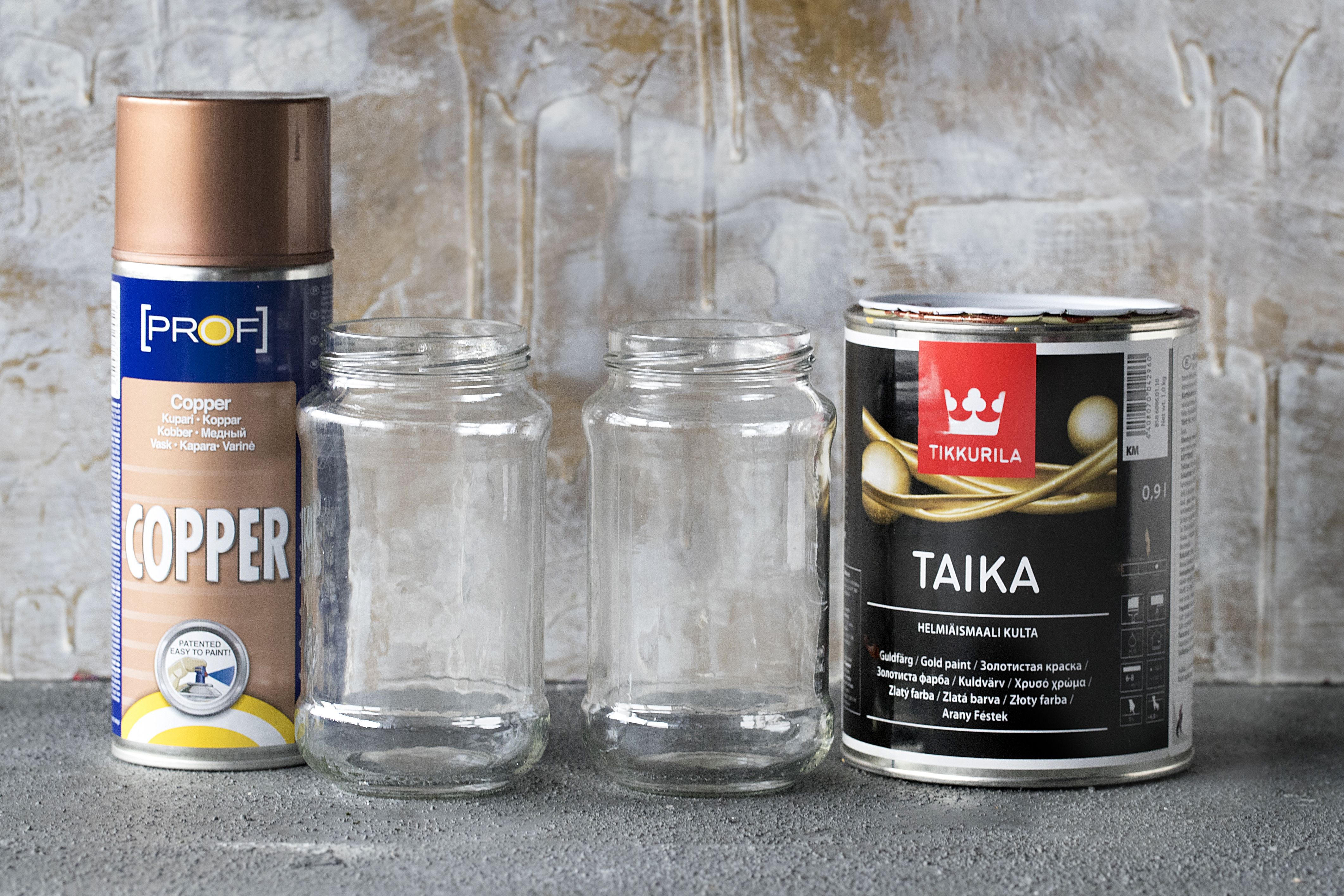 Kuparinen spraymaali sopii mainiosti mattapintaisen lopputuloksen aikaansaamiseen. Jos tahdot tuoda lasin omintakeisen kiillon esiin, valitse maali, jonka avulla maalaat purkin sisältä.