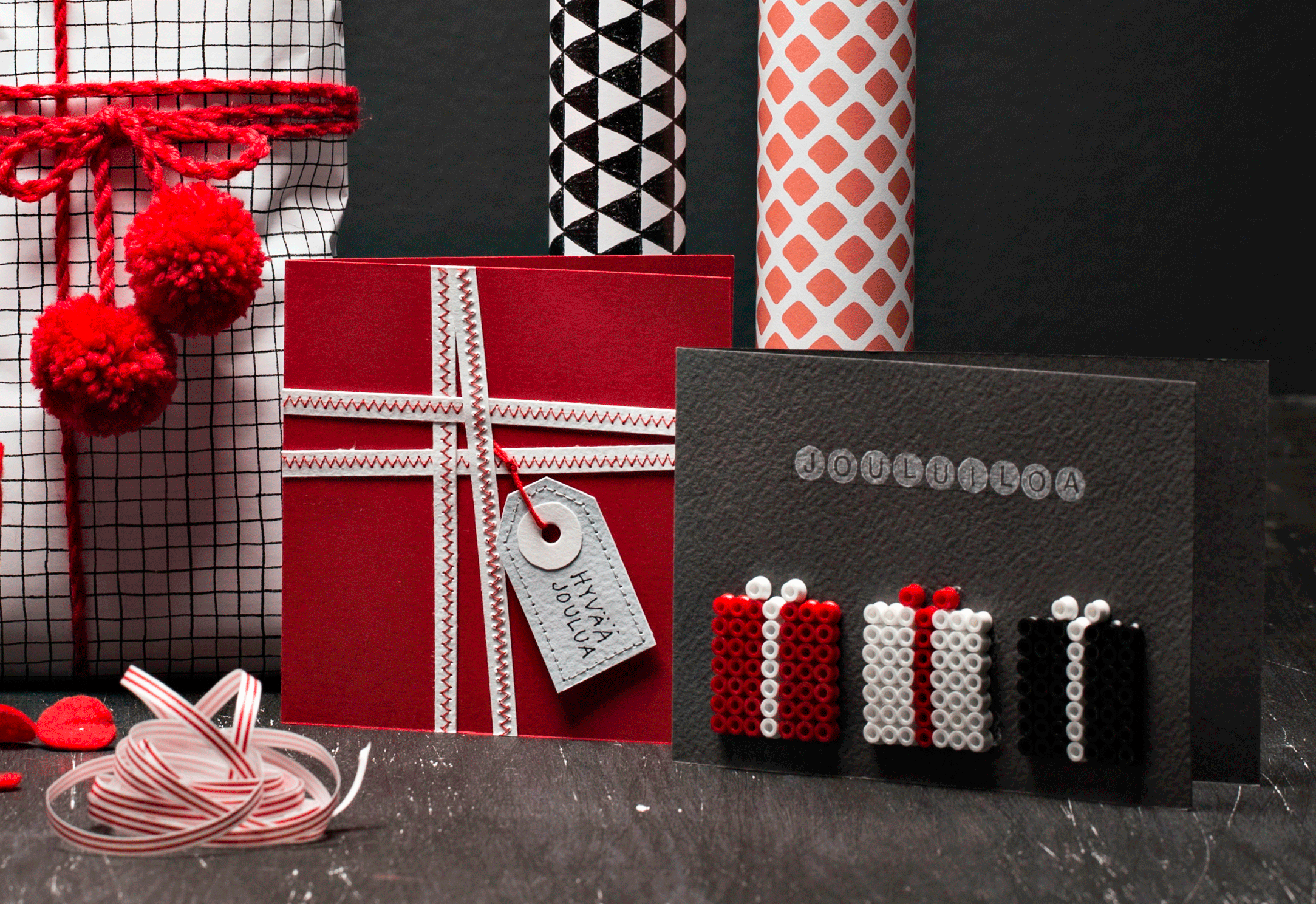 Tee hamahelmistä kolme 7x7 helmen neliöitä: punainen, jonka keskellä on valkoinen pystyraita, valkoinen, jossa on punainen raita ja musta, jossa on valkoinen raita. Lisää neliöiden päälle ruseteiksi kaksi pystyraidan väristä helmeä, helmet ovat raidan molemmilla puolilla. Kiinnitä helmet toisiinsa leivinpaperin läpi silittämällä. Liimaa paketit korttipohjaan. Paina korttiin leimasimilla teksti JOULUILOA.
