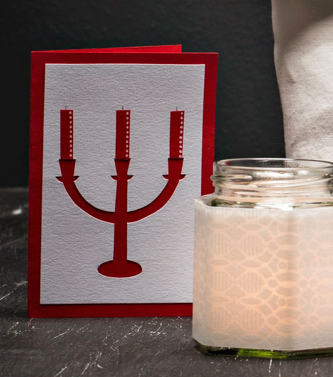 Leikkaa valkoisesta kartongista 9x13,3 cm pala. Jäljennä kynttelikön kaava lehden sivulta. Piirrä se kartongin alareunaan ja leikkaa teräväkärkisellä askarteluveitsellä. Liimaa kartonki punaiselle korttipohjalle. Leikkaa teipistä kolme 0,7x2,7 cm:n palaa ja liimaa ne kynttilöiksi. Piirrä kynttilöille sydämet.