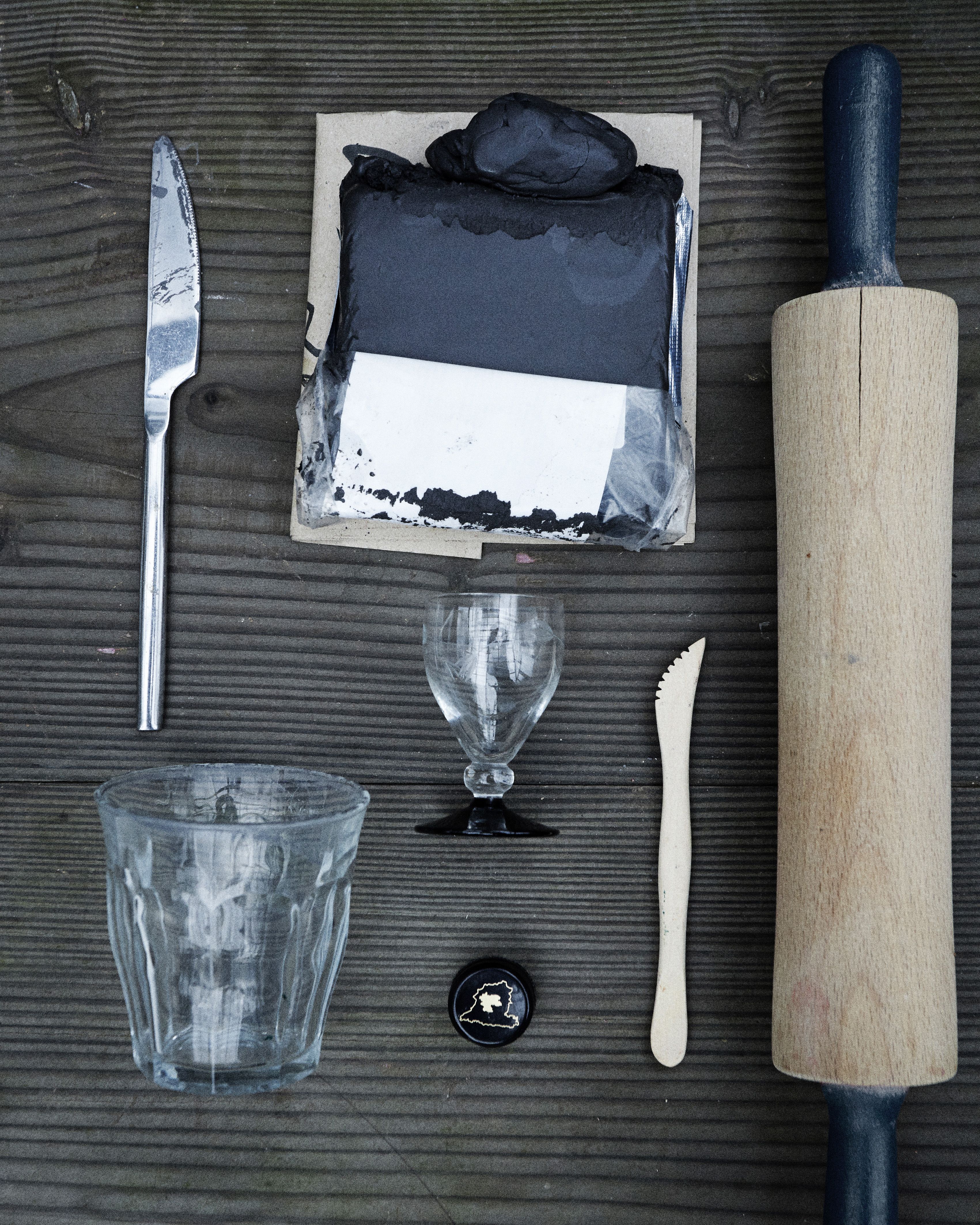 Kauli tummanharmaata, kovettuvaa muovailumassaa noin neljän millin paksuiseksi levyksi.