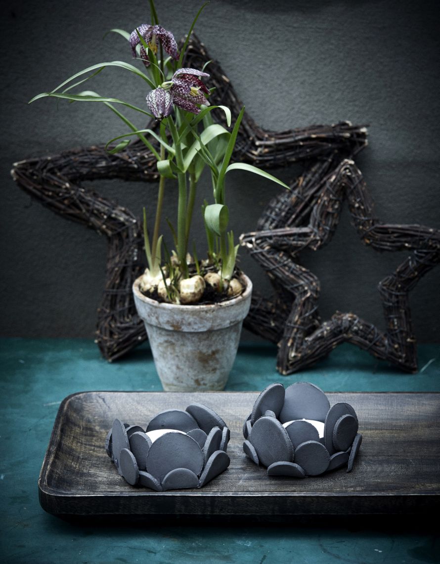 Vanhasta puutarjottimesta saa petsaamalla upean alustan keraamisille tuikkulyhdyille.
