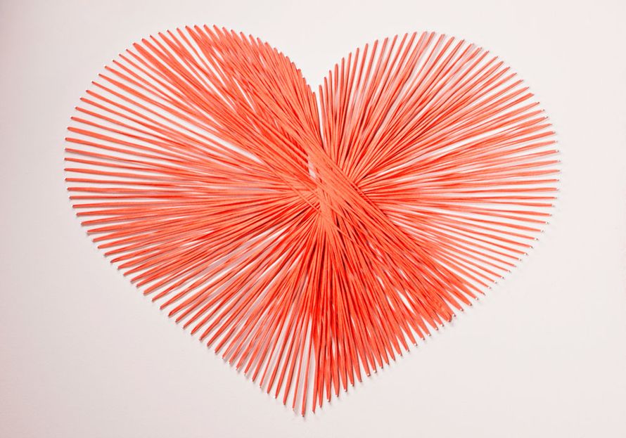 3. Täytä sydän kieputtamalla lankaa naulojen ympäri ja kuljettamalla lankaa vastakkaiselle puolelle ja takaisin. Jatka kunnes lanka on kiertänyt koko sydämen.