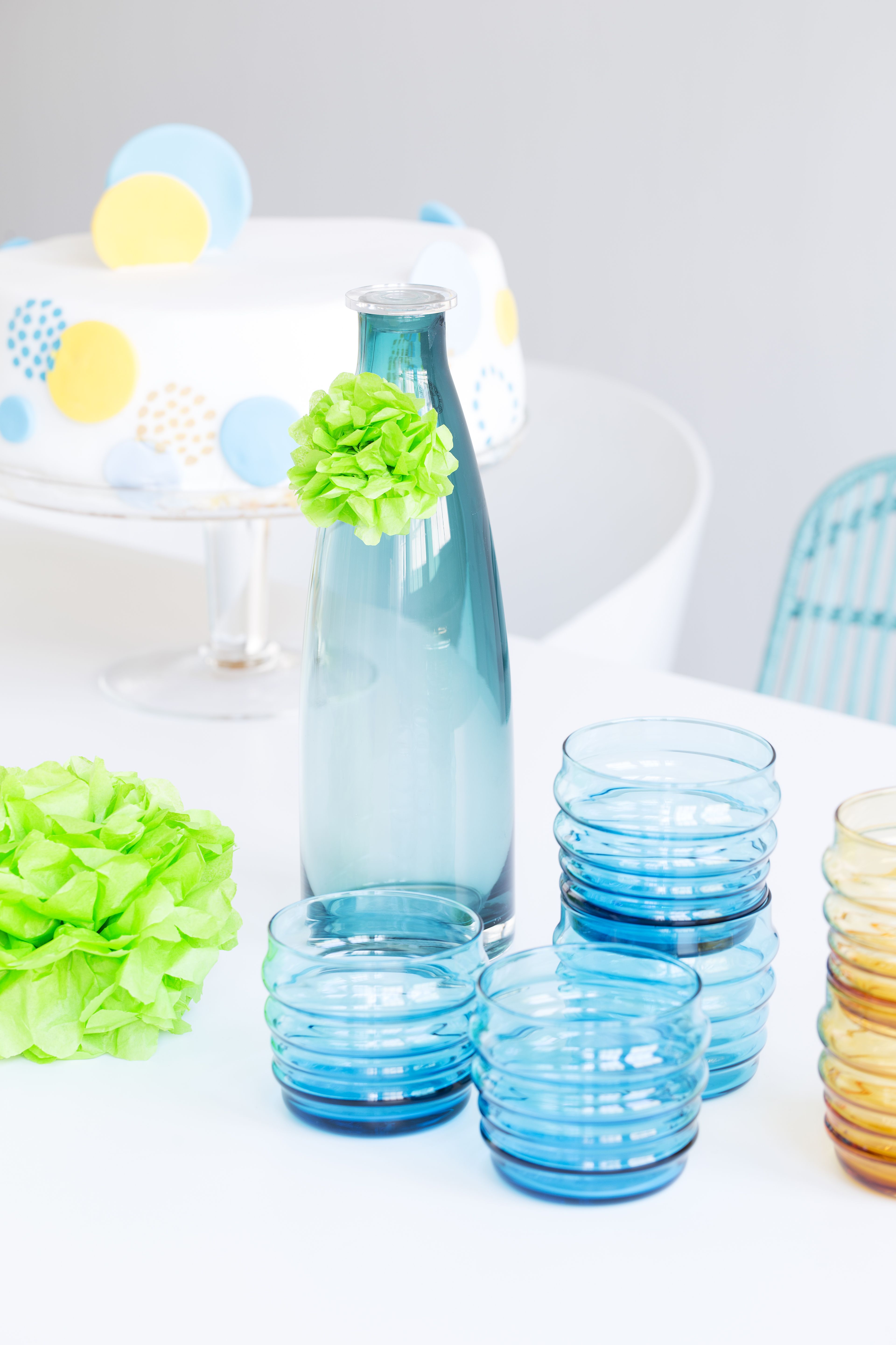 - Paperipallot somistavat pöydässä pullonkauloja ja lasinjalkoja.