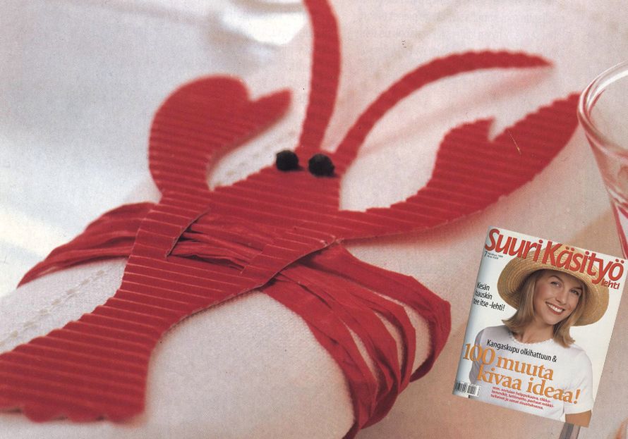 Näyttävä ravunmuotoinen serviettirengas on Suuri Käsityö -lehden retro-ohje kesältä 1999. Renkaat kietaistiin lautasliinojen ympärille paperilangalla ja silmiksi liimattiin pippurit.