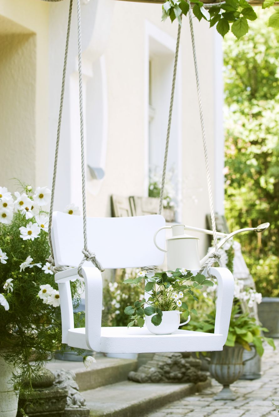 Mikä olisi ihanampaa kuin istuskella puutarhakeinussa? Romanttinen valkoinen keinu syntyy vanhasta tuolista. Tämän tuolin voi siirtää talveksi sisälle, vaikka lastenhuoneeseen tai lasitetulle terassille leppoisten syysiltojen iloksi.