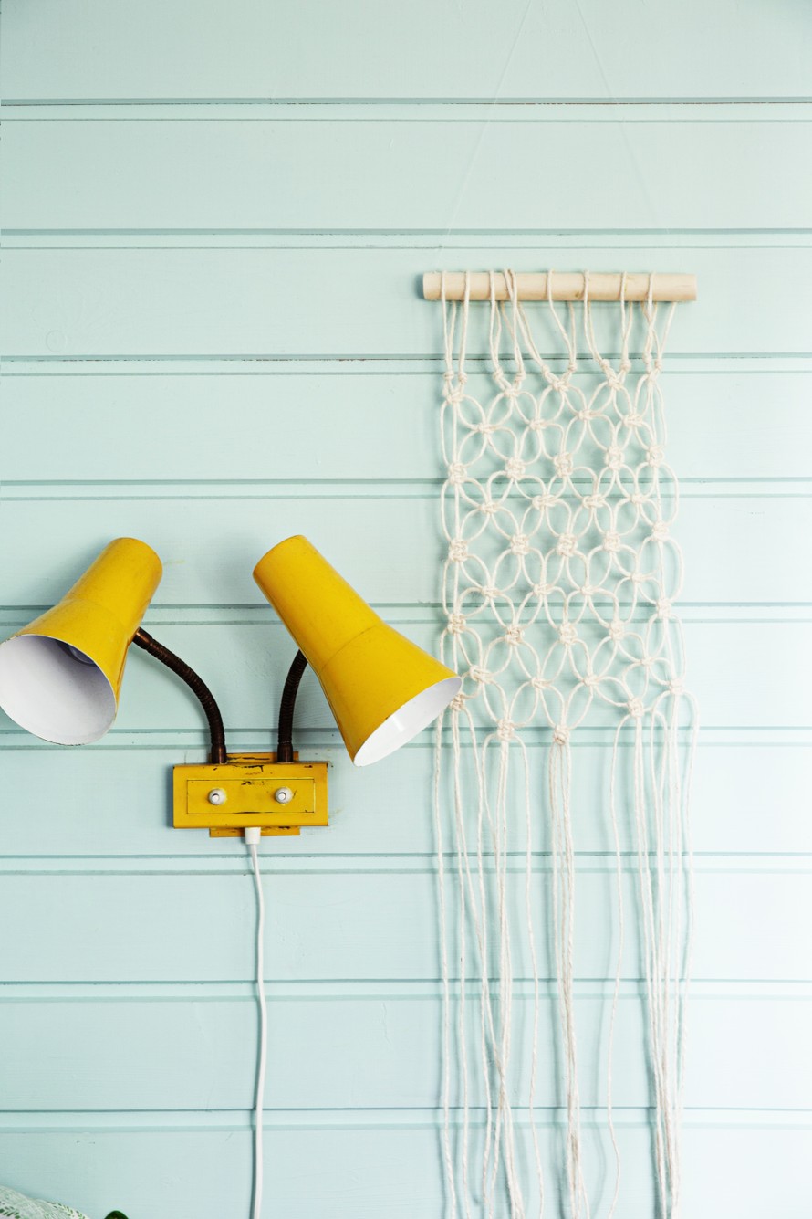 Pieni, muodikas seinävaate on tehty juuttinarusta. Katso ohje makrameesolmeilusta.