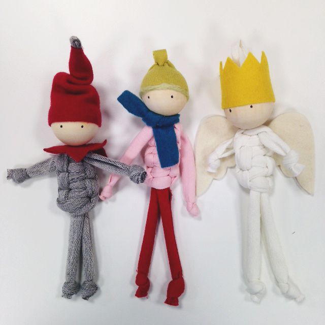 6. Liimaa kruunu, tonttulakki tai pipo päähän. Liimaa siivet. Solmi kaulahuivi tenavalle. Kun liima on kuivunut, piirrä nukelle silmät tussilla.