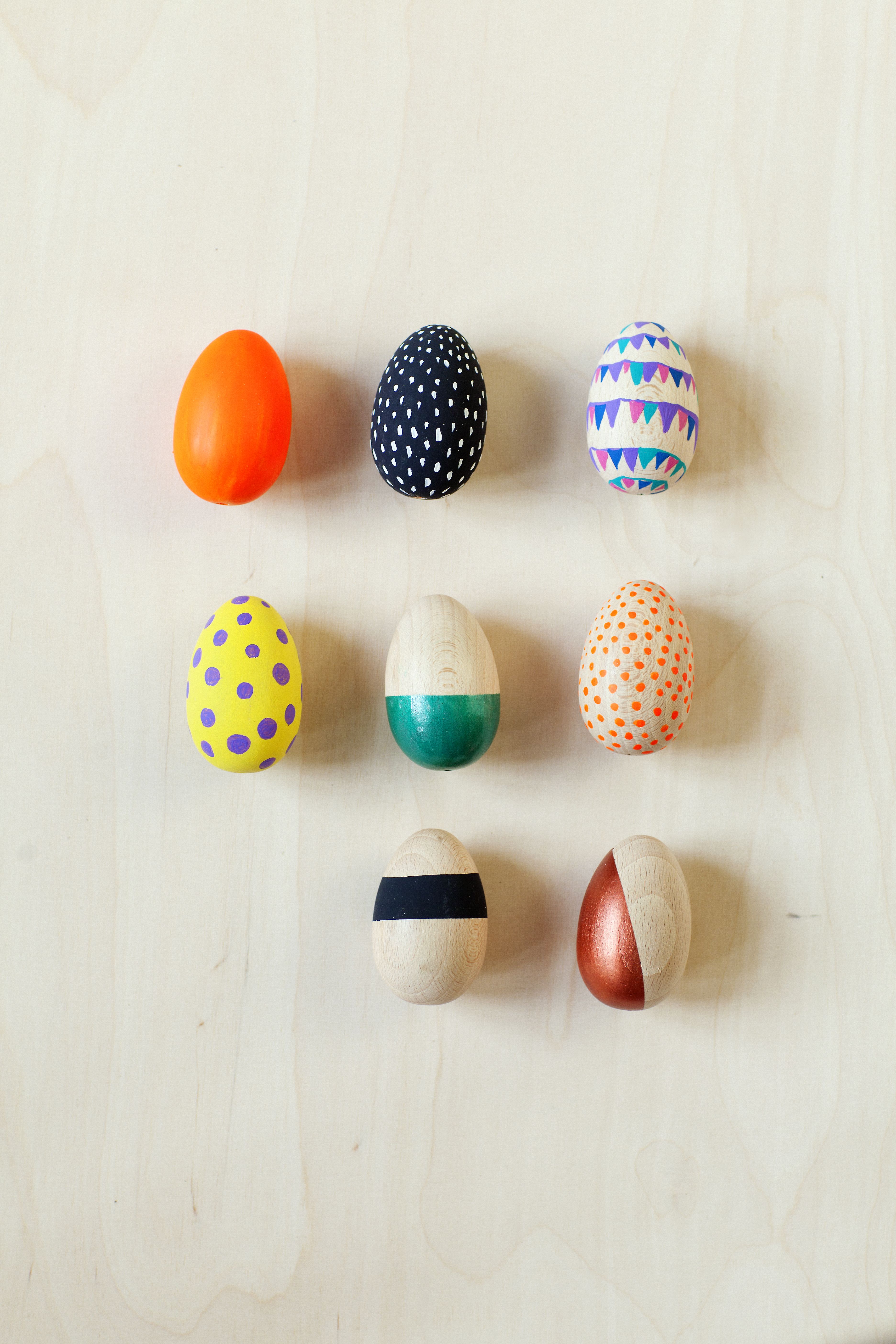 Ajattoman komeita koristemunia saat maalaamalla puumuniin simppelin pilkkukuosin tai selkeitä raitoja ja värialueita. Rajaa maalarinteipillä se osa munasta peittoon, jonka haluat jäävän puunsävyiseksi. Maalaa näkyviin jäävä alue askartelu- tai akryylimaalilla. Pienoismallimaaleista on tarjolla tyylikkäitä metalli- ja fosforisävyjä. Poista sitten teippi. Jos käytät useita maalisävyjä, anna yhden värin kuivua kunnolla ennen seuraavan lisäämistä.