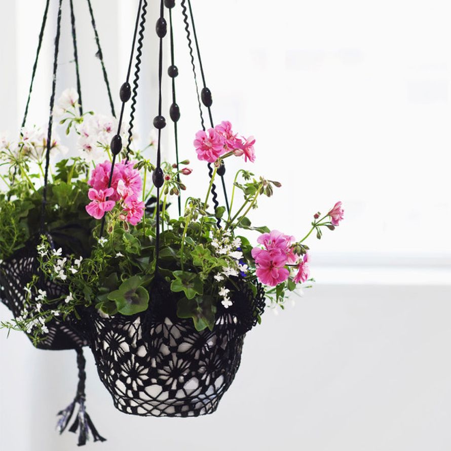 Värjätyt pitsiliinat muuttavat tavalliset muoviruukut kauniiksi amppeleiksi.