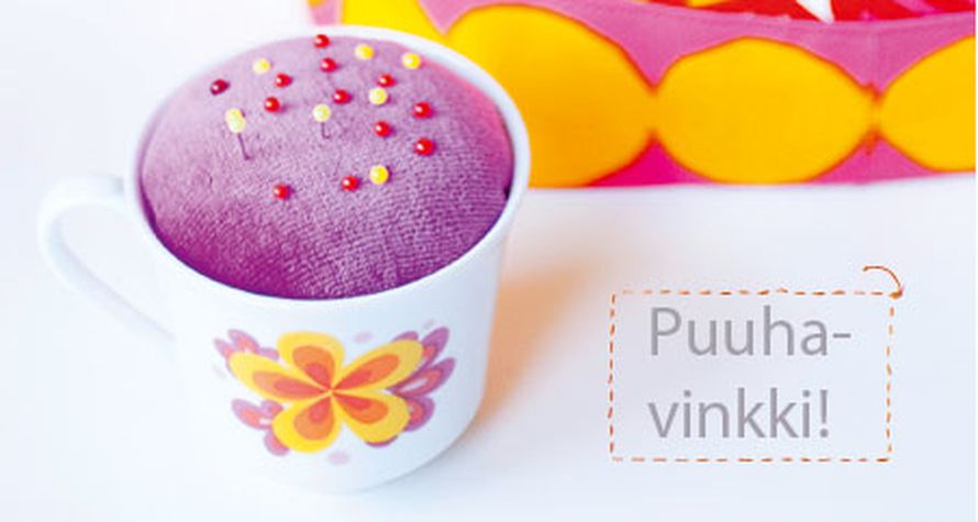 Parittomasta kahvikupista saat hurmaavan nuppineulatyynyn. Kotoa löytyy helposti sopiva pieni kankaanpala.