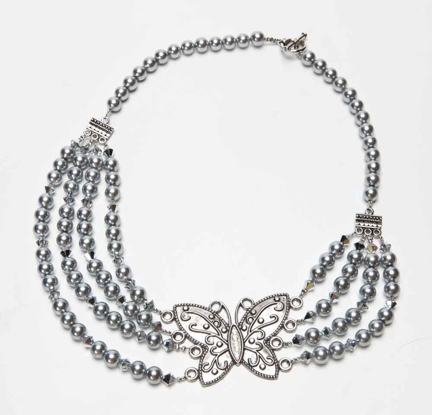 Tarvikkeet: Koruvaijeri, Beadalon 0,46 mm, harmaita vahahelmiä noin 50 kpl, koko 8 mm, korujakaja suuri perhonen, Swarovski-helmiä, Comet Argent Light, noin 30 kpl 6 mm, 2 kpl 3 reikäisiä korujakajia, lukkosetti, lukitushelmet ja työskentelyyn erilaisia askartelupihtejä.
