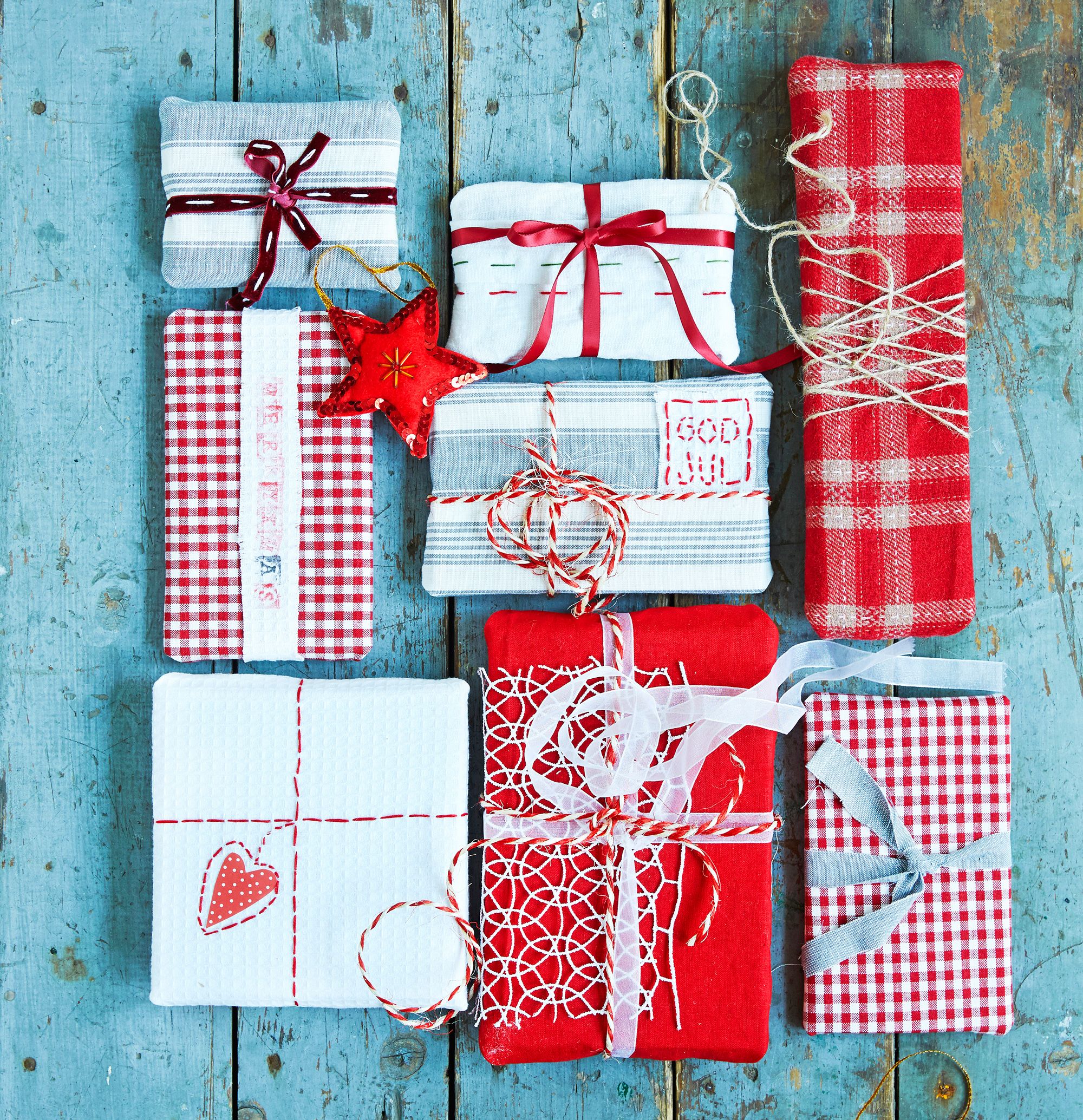 Lahjakääreenä käytetyt kauniit kankaat ja keittiötekstiilit ilahduttavat joulusta toiseen. Vohvelikankaaseen on helppo kirjoa lahjanauha ja joulutoivotus. Harmaaraitaiset ja valkoiset paketit on tehty keittiöpyyhkeistä.