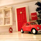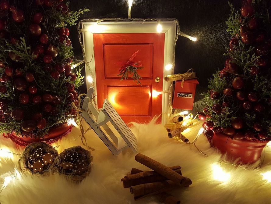 "Rakensin kotiin tonttuoven ja sen ympärille tonttumaailman. Tontun ovi on rakennettu pahvista valokuvakehykseen. Postilaatikko on tulitikkuaski." Johanna Suonpää