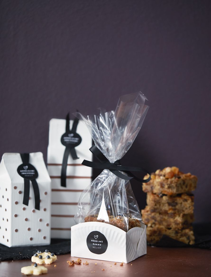 - Voit sujauttaa herkut joko suoraan rasiaan tai laittaa ne pieneen läpinäkyvään pakaste- tai sellofaanipussiin ja sulkea kauniilla rusetilla. Herkut voi myös laittaa rasiaan voipaperiin käärittyinä. Pussissa leivonnaiset säilyvät pidempään tuoreina, ja rasiasta napostelu onnistuu sormia sotkematta.