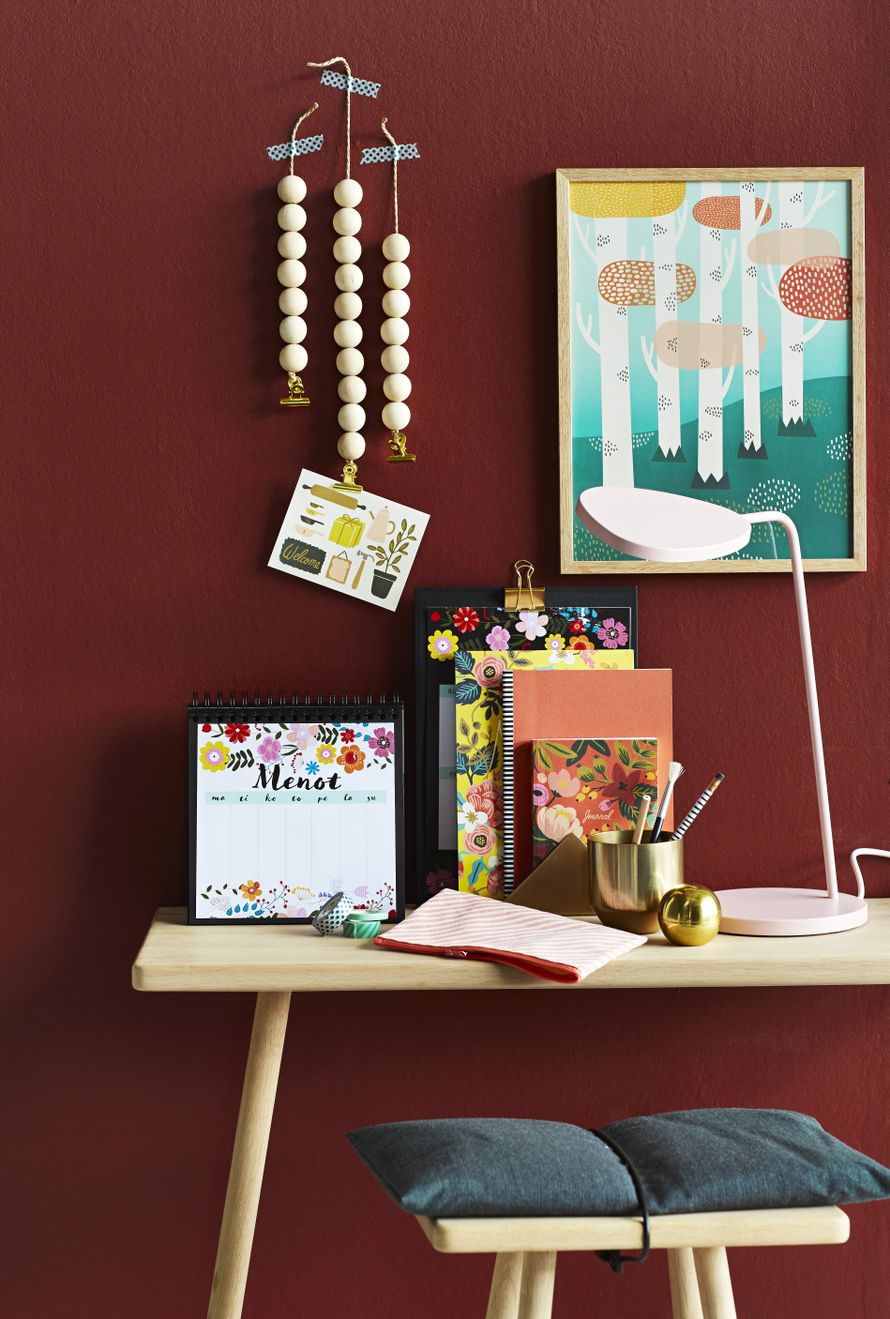 Puupallot ja hamppunaru, Sinelli. Muistivihot, kortti ja taulu, Papershop. Messinkiruukku ja -säilytysrasia, H&M Home. Raidallinen kynä ja messinkiklipsit, Olkkari. Penaali ja teipit, Flying Tiger. Albumi ja pahvipohja, Granit. Ferm Livingin messinkiteline, Stockmann. Leaf-pöytävalaisin, tamminen Georg-konsolipöytä ja -jakkara, Muuton tyyny ja Hayn päiväpeitto, Formverk. Seinämaali Tikkurilan Harmony sävy M423.
