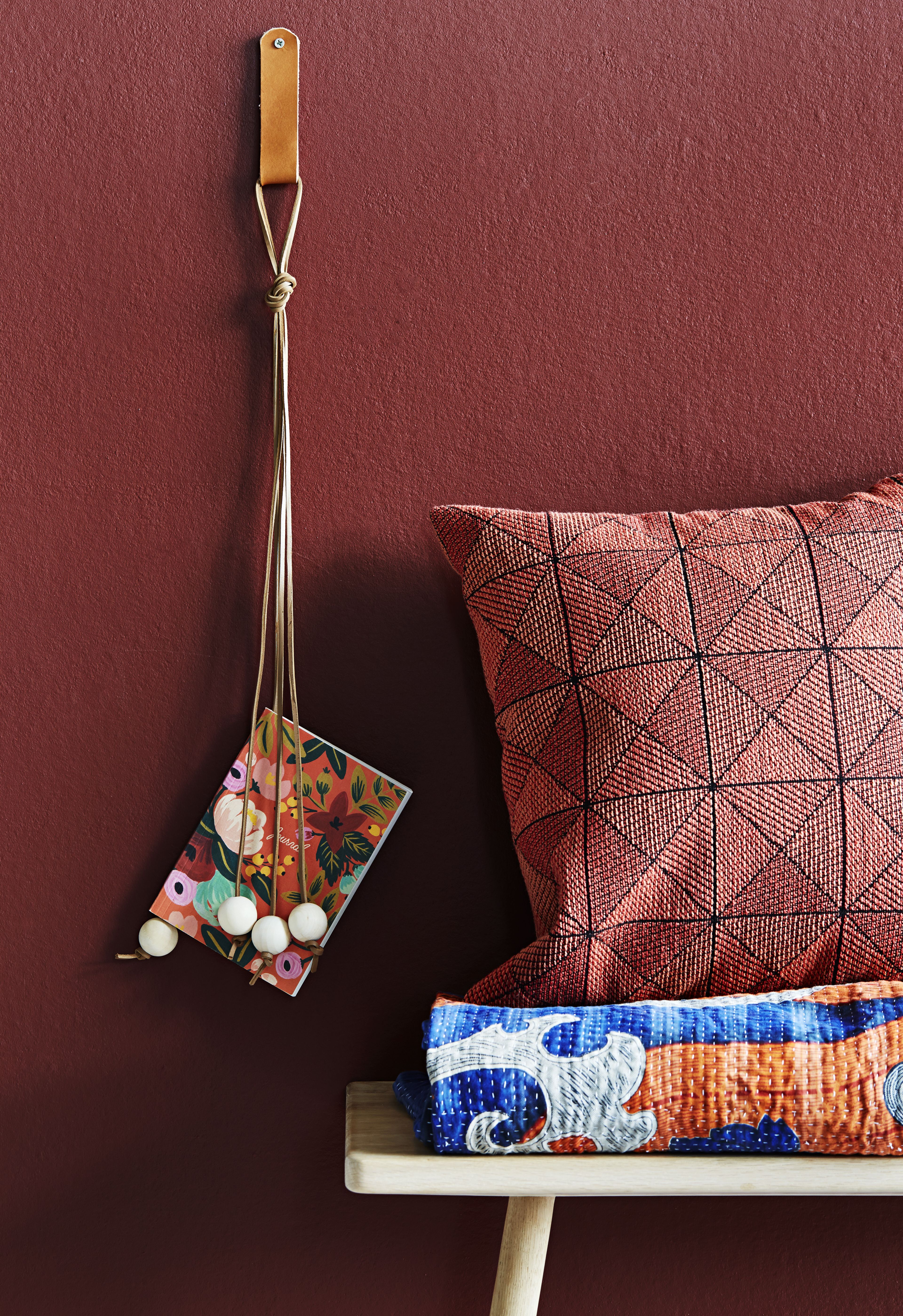 4. Leikkaa vaikka vanhasta vyöstä 20 sentin suikale. Pyöristä suikaleen päät saksilla ja pujota se äsken tekemäsi lenksun läpi. Kiinnitä ruuvilla seinään. Suoraan nahan läpi on helppo porata.