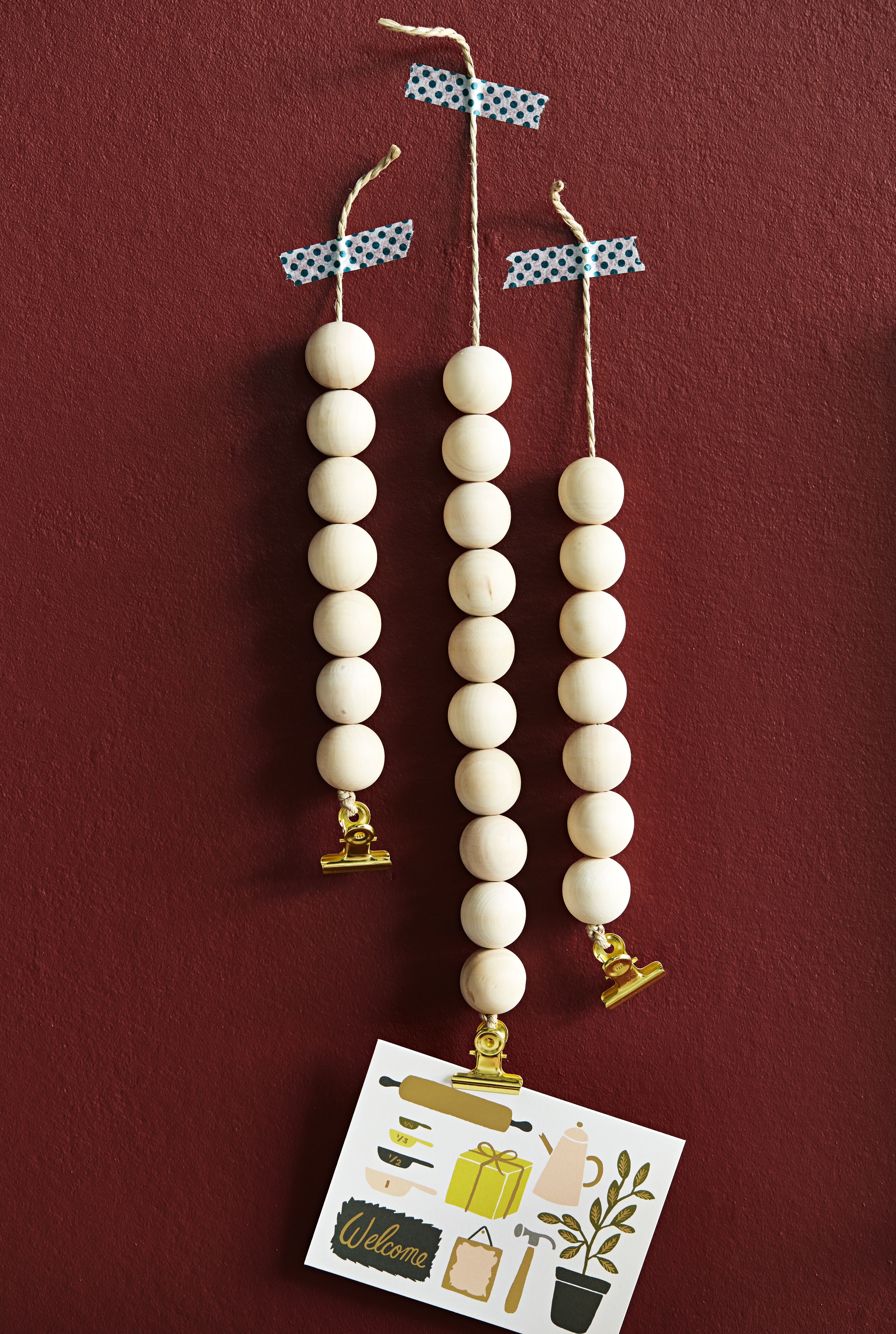 1. Mittaa hamppunarusta haluamasi pituus ja pujota siihen puupalloja. Sido klipsi pallorivistön toiseen päähän. Jos teet useamman ripustimen, laita niihin eri määrä palloja. Silloin muistilappusi näkyvät eivätkä mene päällekkäin, kun ripustat ne seinälle.