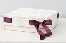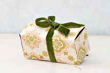 Taita laatikon kaavassa katkoviivoin merkityt linjat ja nosta laatikon sivut ylös. Liimaa kulmat ja taita laatikon suilta varat nurjalle, liimaa kiinni. Sulje rasian kansi ja kääri ympärille samettinauha.